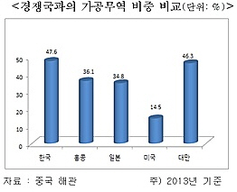 특히 지난해 기준 경쟁국인 일본(34.8%)과 홍콩(36.1%)보다 10% 이상 높았고 미국(14.5%)보다는 3배나 높은 수치를 기록했다. 다만 대만(46.3%)과는 비슷한 수준을 보였다.