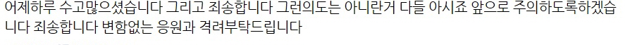 이에 롯데자이언츠 응원단장은 자신의 트위터를 통해 “어제 하루 수고많으셨습니다. 그리고 죄송합니다. 그런 의도는 아니란 거 다들 아시죠? 앞으로 주의하도록 하겠습니다. 죄송합니다. 변함없는 응원과 격려 부탁드립니다”라고 사과했다.