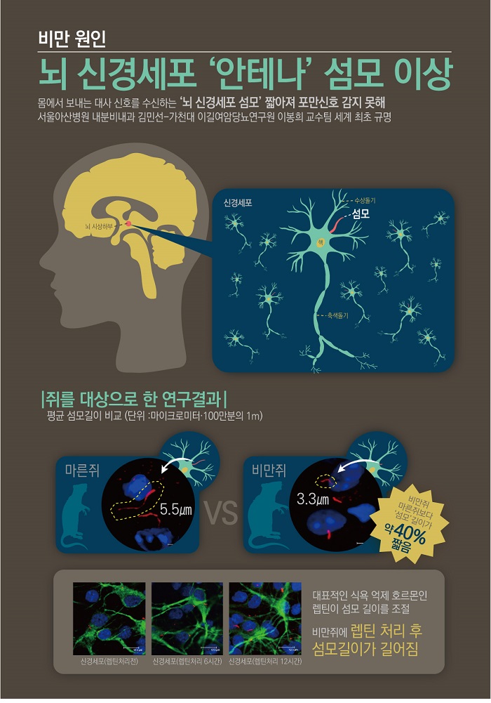 서울아산병원 내분비내고 김민선 교수팀과 가천대 이길여 암당뇨 연구원 이봉희 교수팀이 밝혀낸 비만의 원인으로 뇌 신경세포에 달려있는 ‘섬모’를 밝혀냈다.