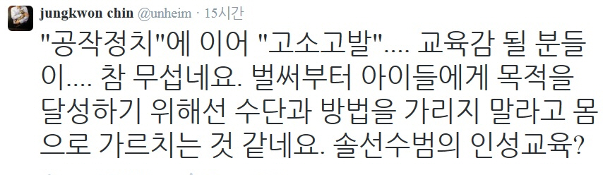 진 교수는 트위터를 통해 “공작정치에 이어 고소고발...교육감 될 분들이... 참 무섭네요. 벌써부터 아이들에게 목적을 달성하기 위해선 수단과 방법을 가리지 말라고 몸으로 가르치는 것 같네요. 솔선수범의 인성교육?”이라고 일침을 가했다.